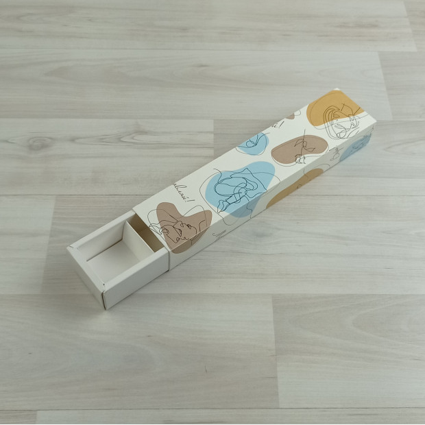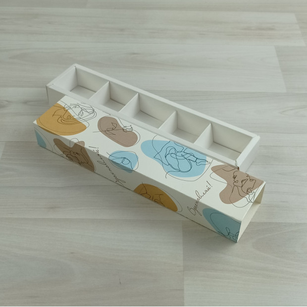 Коробка на 5 конфет из мелованного картона. Крышка глухая с тематическим рисунком, тип "Шубер" (задвигается как спичечный коробок).