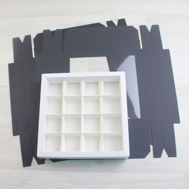 Крышка - дизайнерский картон, цвет черный, дно и разделители - мелованный картон