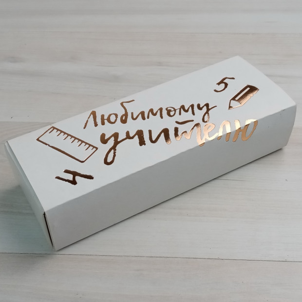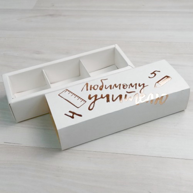 Коробка на 3 конфеты из белого мелованного картона с тиснением. Крышка из белого мелованного картона, тип "Шубер" (задвигается как спичечный коробок). Склейка не требуется.