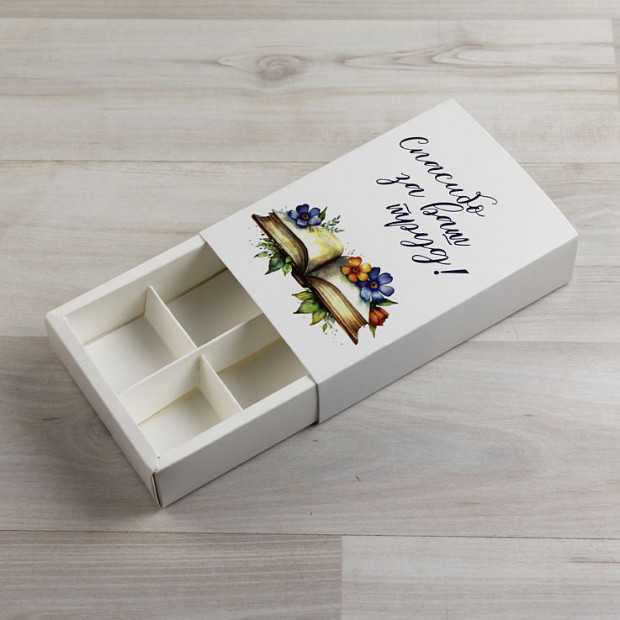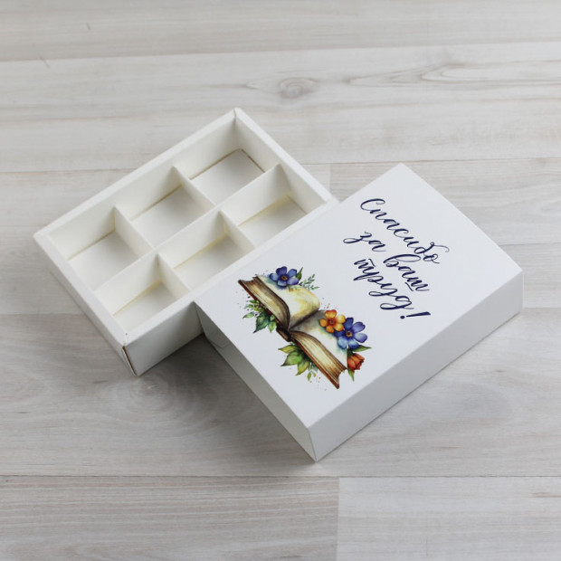 Вкладыш-разделитель на 6 конфет входит в комплект. Если вкладыш не нужен - напишите нам, мы вычтем -5р/шт. Коробка поставляется в виде заготовки и требует сборки. Пожалуйста, учитывайте, что коробки тиражом более 10 штук можно заказать только кратно десяти.
