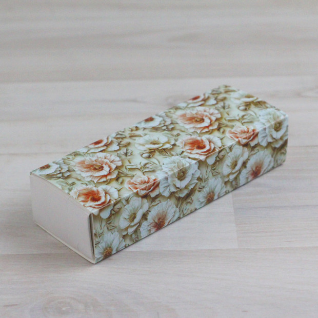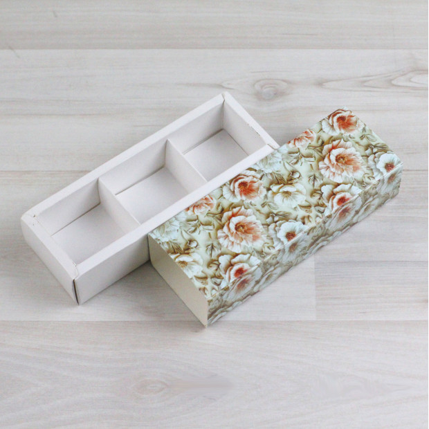 Коробка на 3 конфеты из мелованного картона. Крышка глухая из мелованного картона, тип "Шубер" (задвигается как спичечный коробок). Склейка не требуется.