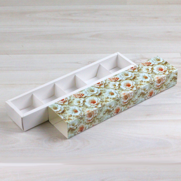 Коробка на 5 конфет из мелованного картона. Крышка глухая с тематическим рисунком, тип "Шубер" (задвигается как спичечный коробок).