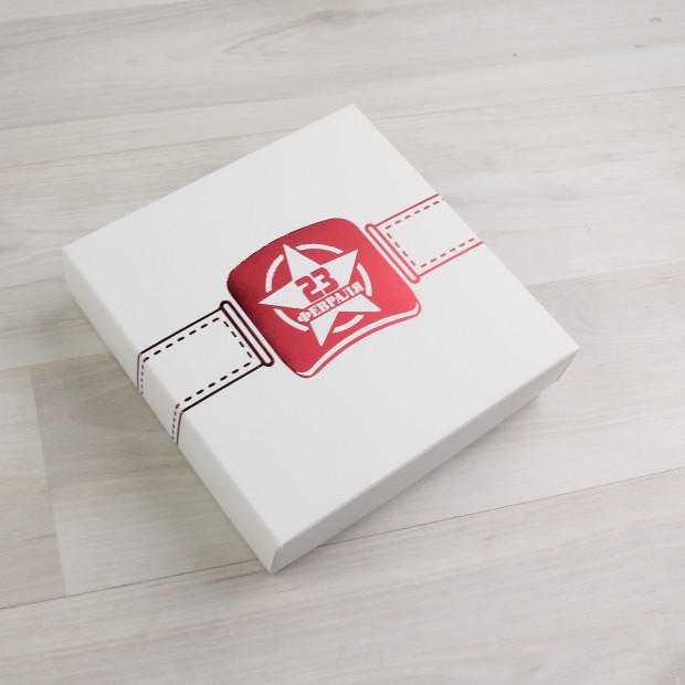 Коробка на 9 конфет из белого мелованного картона. Крышка глухая с тиснением "Ремень. 23 февраля".
