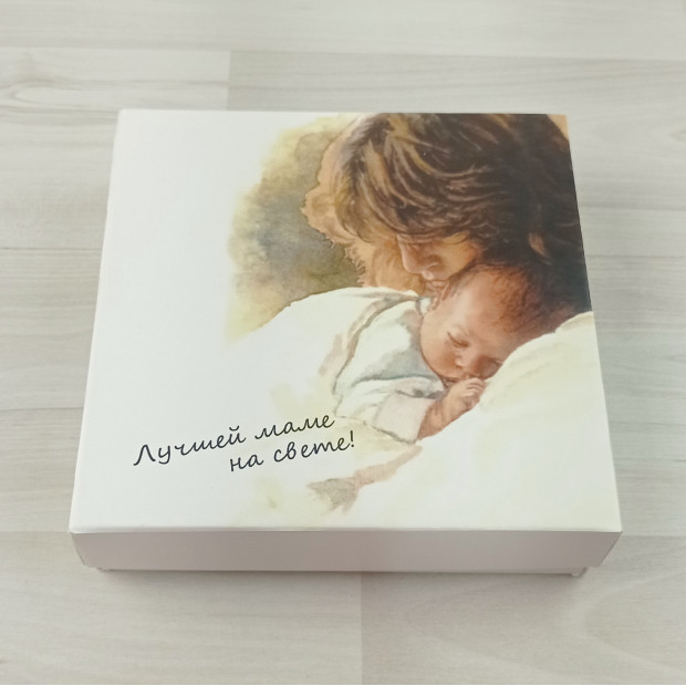 Коробка на 9 конфет с разделителями. Крышка - дизайнерский картон/ дно и разделители - мелованный картон с тематическим рисунком.