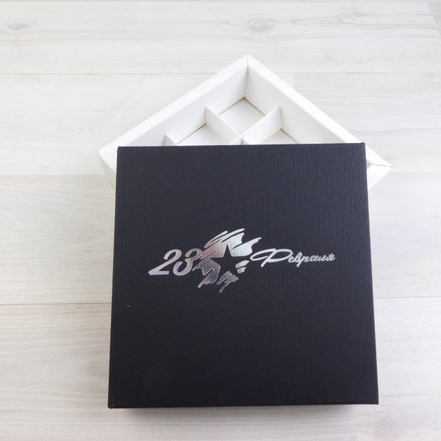 Крышка - дизайнерский картон/ дно и разделители - мелованный картон.