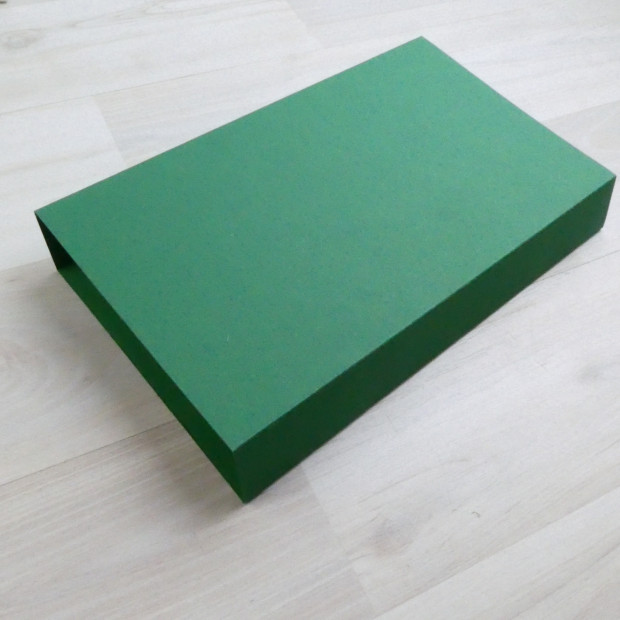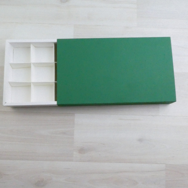 Коробка на 15 конфет из белого мелованного картона. Крышка из дизайнерского картона, тип "Шубер" (задвигается как спичечный коробок). Склейка не требуется.