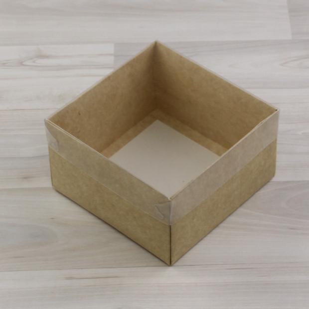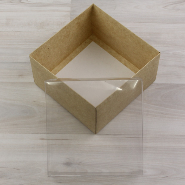 Коробка из крафт-картона. Крышка прозрачная ПВХ. Превосходно подходит для подарочных наборов.