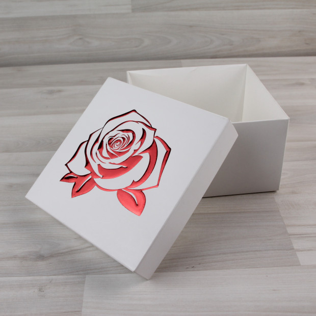 Коробка Атлас, белая, с рельефным тиснением "Роза" красным