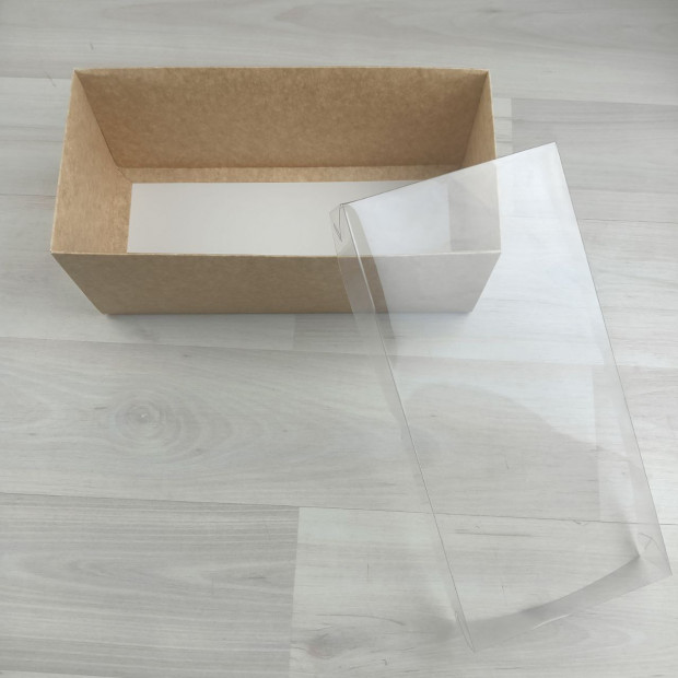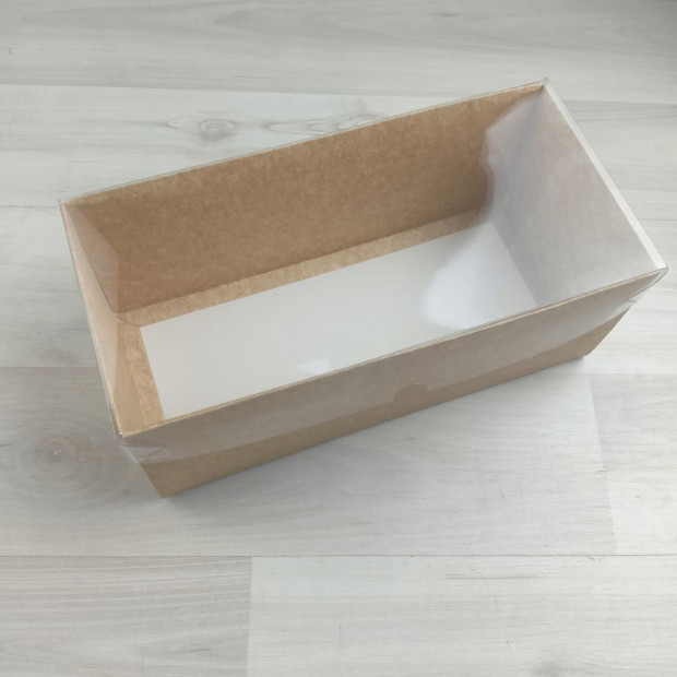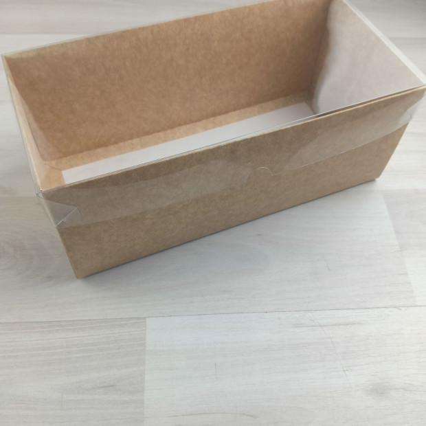 Коробка из краф картона. Крышка глухая прозрачная. Превосходно подходит для подарочных наборов. Так же можно использовать для кондитерских изделий, например рулета.