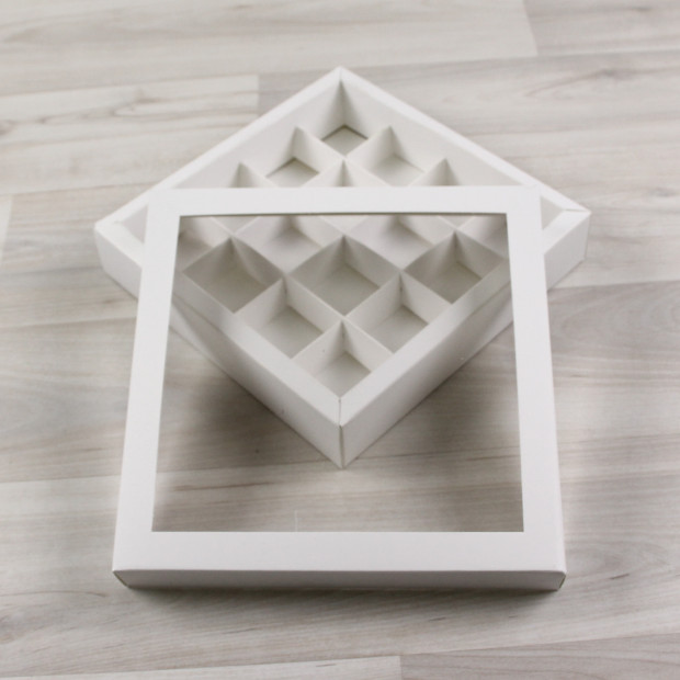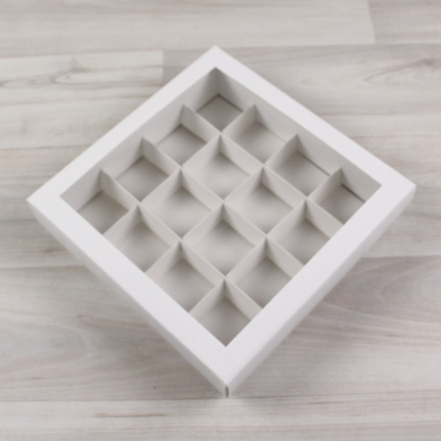 Коробка на 16 конфет из мелованного картона. Крышка с квадратным окном.
