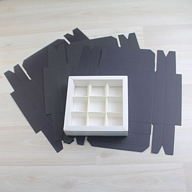 Вкладыш-разделитель на 9 конфет входит в комплект. Если вкладыш не нужен - напишите нам, мы вычтем -5р/шт. Коробка поставляется в виде заготовки и требует сборки. Пожалуйста, помните, что коробки тиражом более 10шт можно заказать только кратно десяти. Данная позиция продается из остатков разных картонов и может отличаться оттенками черного цвета.