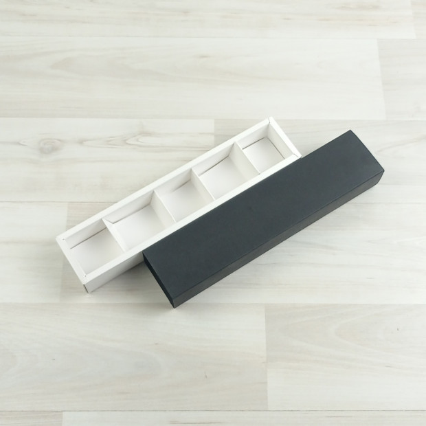 Коробка на 5 конфет. Крышка глухая из дизайнерского картона, тип "Шубер" (задвигается как спичечный коробок). Поставляется разобранной, склейка крышки не требуется.