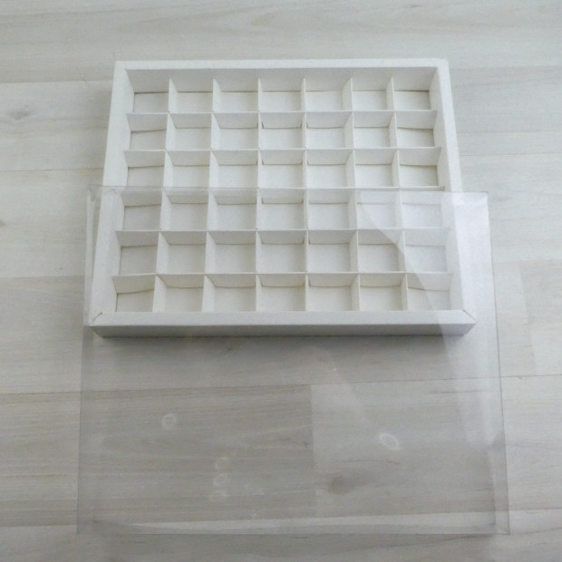 Коробка на 42 конфеты Прозрачная крышка. Дно, картон окрашенный в массе.