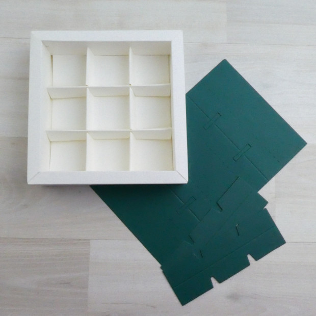 Коробка на 9 конфет. Крышка выполнена из дизайнерского картона. Дно и крышка из белого мелованного картона. Цветной разделитель. Картон окрашенный в массе.