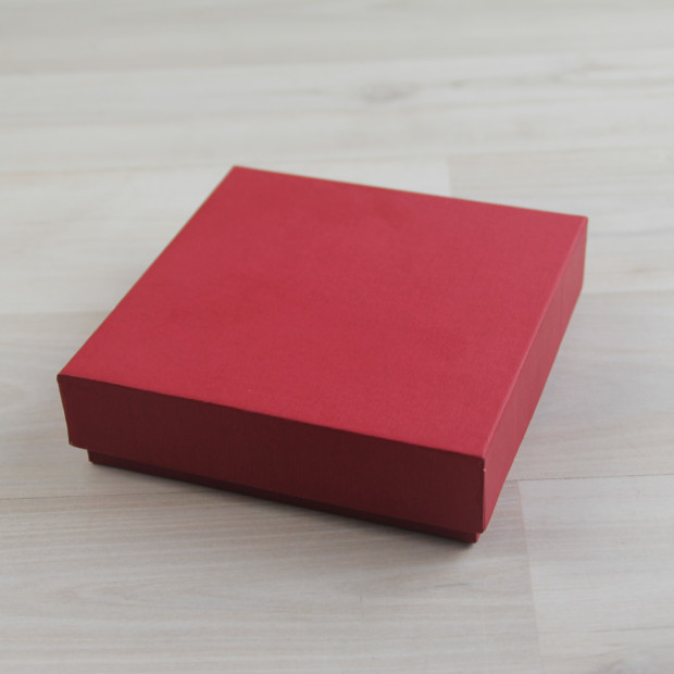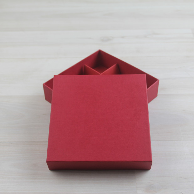 Коробка выполнена по технологии каширования (крышка и дно сделаны из толстого переплетного картона и оклеены красной дизайнерской бумагой с фактурой "тонкий лен"). Разделители вырублены из красного дизайнерского картона. Под заказ на крышке возможно нанесение рисунка или логотипа методом горячего тиснения.