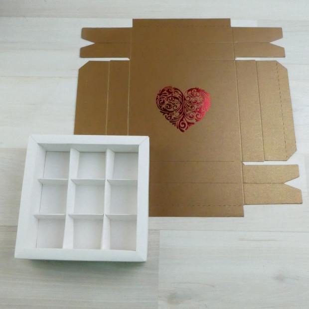 Вкладыш-разделитель на 9 конфет входит в комплект. Если вкладыш не нужен - напишите нам, мы вычтем -5р/шт. Коробка поставляется в виде заготовки и требует сборки. Пожалуйста, помните, что коробки тиражом более 10шт можно заказать только кратно десяти.