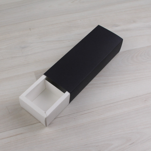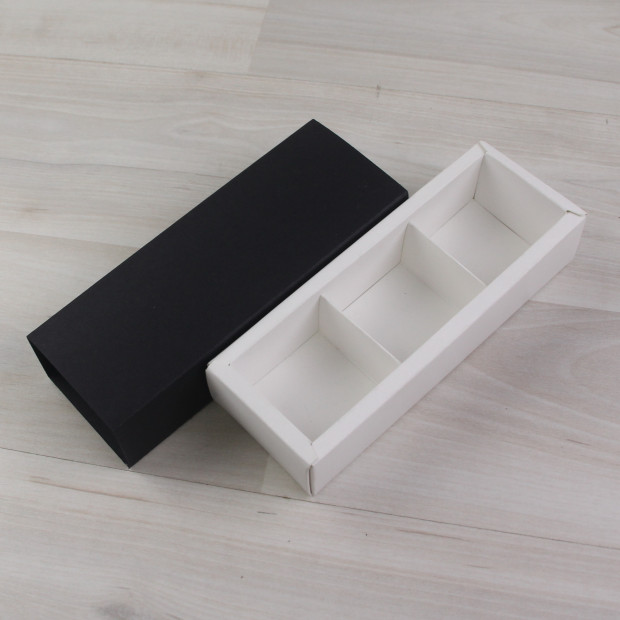 Коробка на 3 конфеты. Крышка глухая из дизайнерского картона, тип "Шубер" (задвигается как спичечный коробок). Поставляется разобранной и требует сборки. Склейка крышки не требуется.