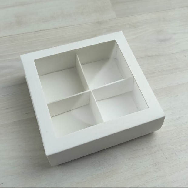 Коробка на 4 конфеты из мелованного картона.