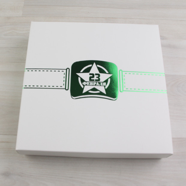 Коробка Элара 16 белый с тиснением "Ремень. 23 февраля" зеленый