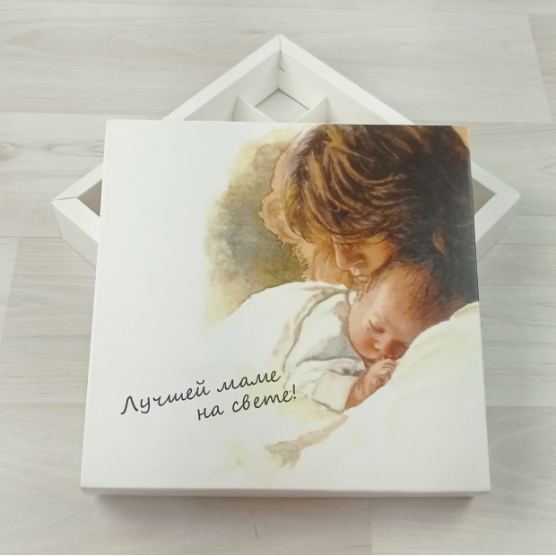 Коробка на 16 конфет с разделителями. Дно - мелованный картон, крышка - мелованный картон с тематическим рисунком.