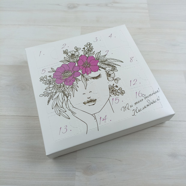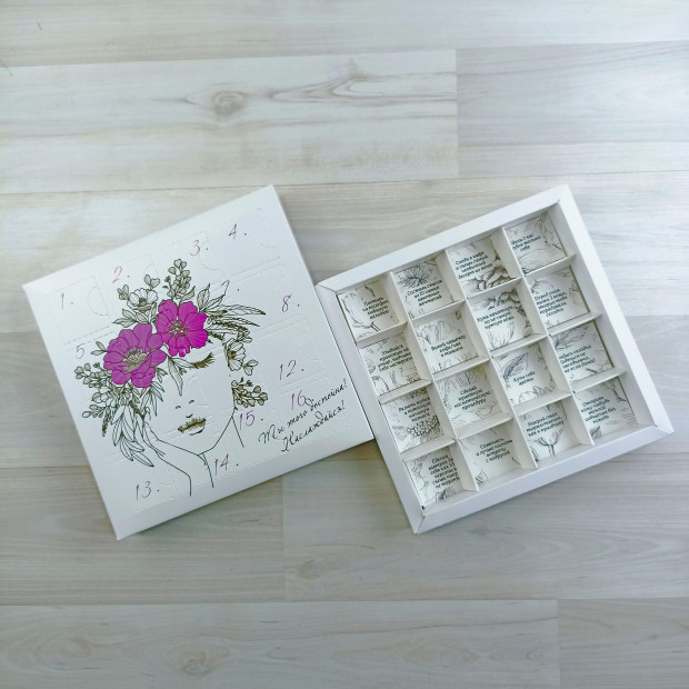 Размеры: - наружный 180*180*27 мм. - внутренний 160*160*25 мм. - ячейка 40*40 мм. ВКЛАДЫШИ С ИНТЕРЕСНЫМИ ЗАДАНИЯМИ НА КАЖДЫЙ ДЕНЬ УЖЕ ВХОДЯТ В НАБОР. - открывающееся окно 32*32 Коробка поставляется в виде заготовки и требует сборки. ⚡Пожалуйста, обратите внимание, что коробки хрупкие. Это сделано для удобства клиента, чтобы открывая одно окошко не отрывали сразу те, что рядом. Но упаковывать в них наборчики нужно очень аккуратно, чтобы не выдавить окошки раньше времени✌ Шубер поступает с прогнутыми биговками для легкости сборки