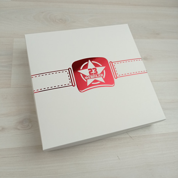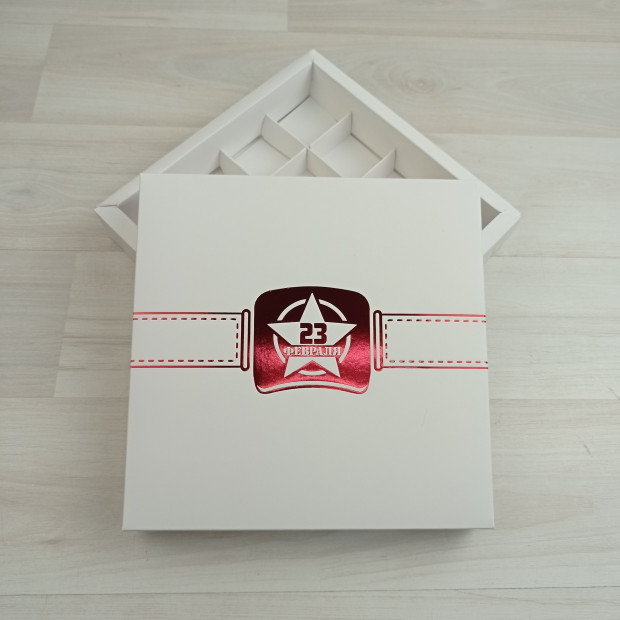 Коробка на 16 конфет из белого мелованного картона. Крышка глухая с тиснением "Ремень.23 февраля" красный.