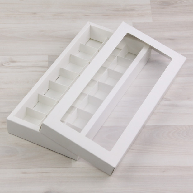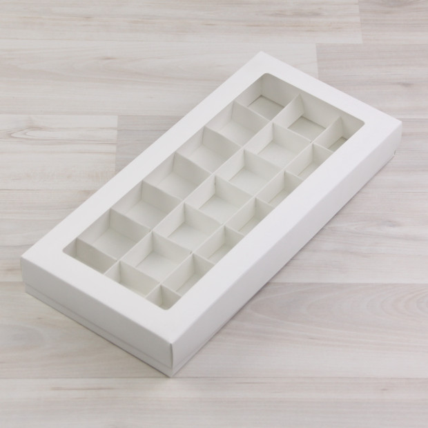 Коробка на 21 конфету из мелованного картона. Крышка с квадратным окном.