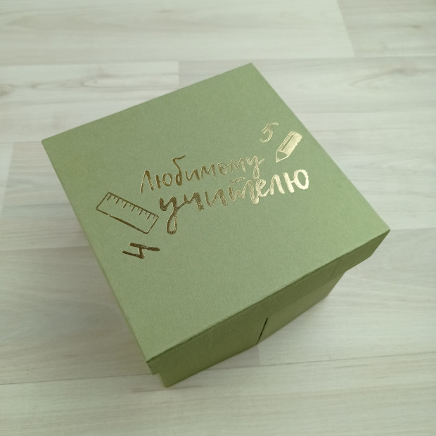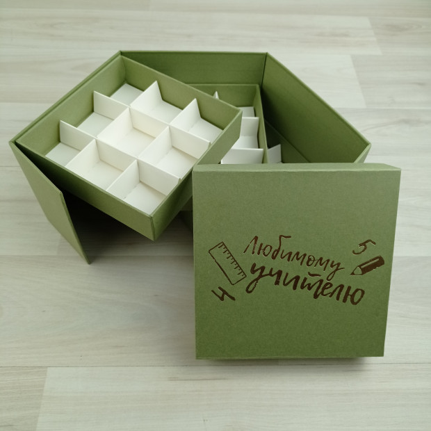 Коробка представляет собой трехярусный раскрывающийся сундучок. Обложка, крышка и ярусы сделаны из толстого переплетного картона и оклеены дизайнерской бумагой. Разделители вырублены из мелованного картона. Тиснение "Любимому учителю" выполнено золотой фольгой.