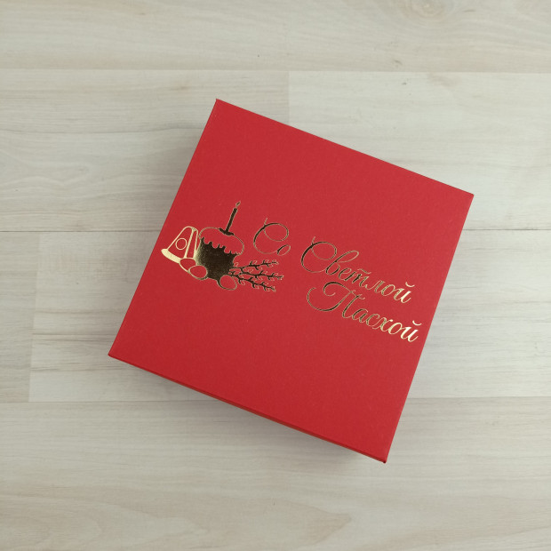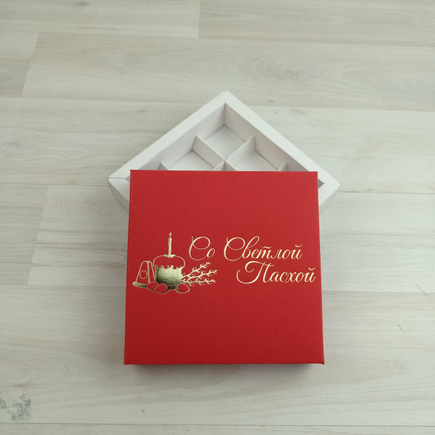 Коробка на 9 конфет с разделителями. Крышка - дизайнерский картон/ дно и разделители - мелованный картон. Картон окрашенный в массе с тиснением "С Светлой Пасхой".