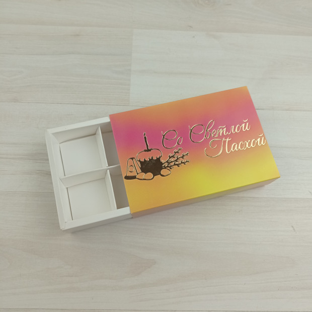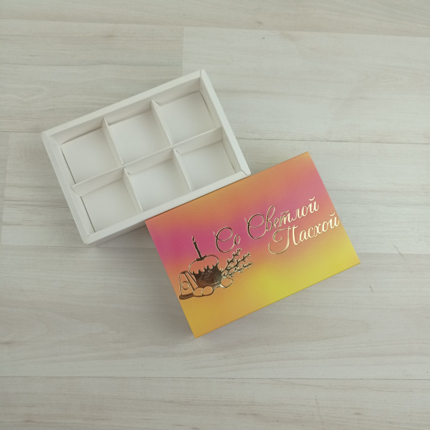 Коробка на 6 конфет. Мелованный картон. Крышка, мелованный картон с тематическим рисунком, тип "Шубер" (задвигается как спичечный коробок). Тиснение золотой фольгой. Расположение элементов может отличатся от предоставленного на фото.