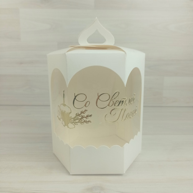 Коробка Кулич Малый, белый стандарт, тиснение "Со Светлой Пасхой" золотом