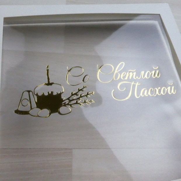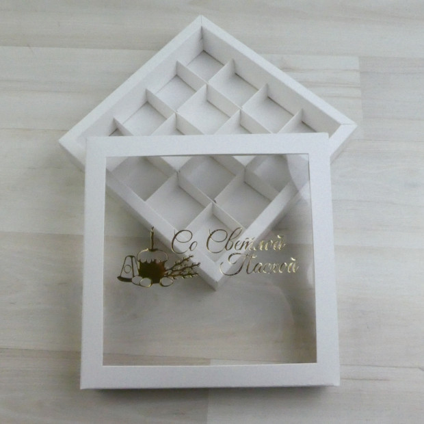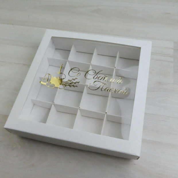 Коробка на 16 конфет из мелованного картона. тиснение золото "Со Светлой Пасхой". Крышка с квадратным окном.
