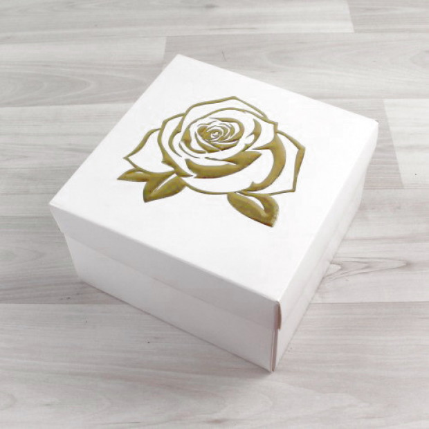 Коробка Атлас, белый, с рельефным тиснением "Роза" золотом