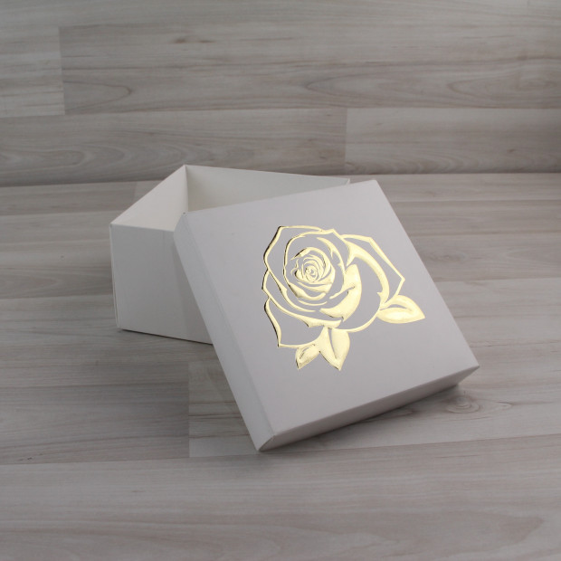 Коробка из мелованного картона. Крышка глухая с рельефным тиснением "Роза".