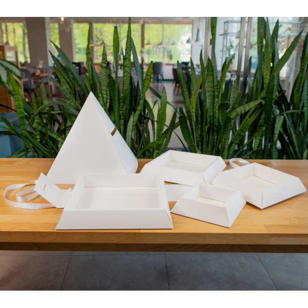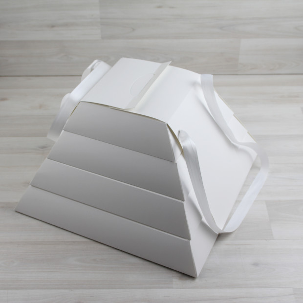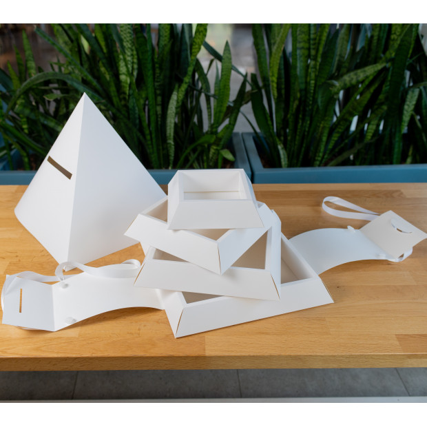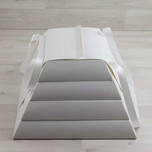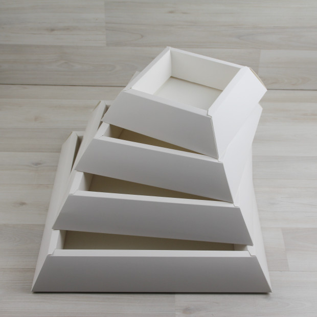 Размеры: - наружный 355*355*385 мм, 1 ярус - наружный 350*350*50 мм, внутренний 280*280*50 мм 2 ярус - наружный 300*300*50 мм, внутренний 230*230*50 мм 3 ярус - наружный 250*250*50 мм, внутренний 180*180*50 мм 4 ярус - наружный 200*200*50 мм, внутренний 130*130*50 мм
