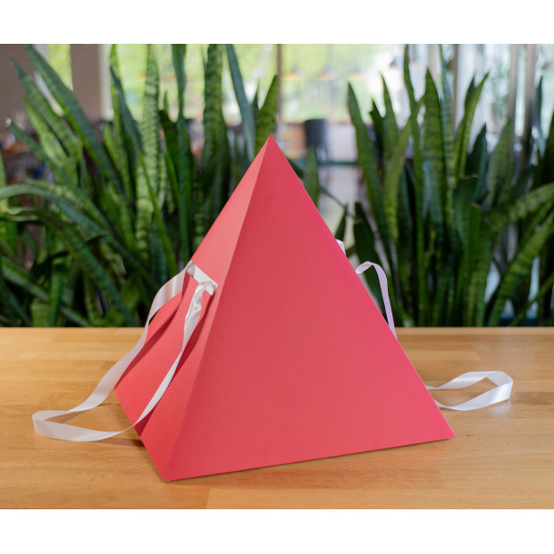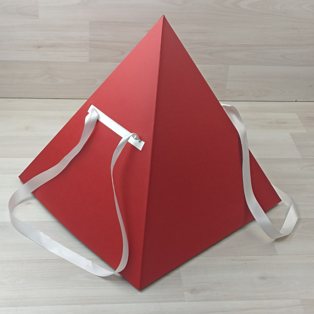 Коробка состоит из 4 ярусов, разных размеров, установленных друг на друга и скрепленных картонным поясом. Сверху накрывается куполом в виде пирамиды. К картонному поясу крепятся ручки из тканой ленты на надежном фиксаторе, которые выпускаются наружу в прорези в куполе и используются для переноски коробки. Это очень удобно в использовании.