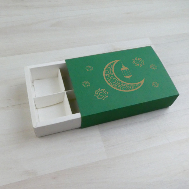 Коробка на 6 конфет. Крышка глухая из дизайнерского картона, тип "Шубер" (задвигается как спичечный коробок). Поставляется разобранной, склейка крышки не требуется. С тиснением "Полумесяц" золото.