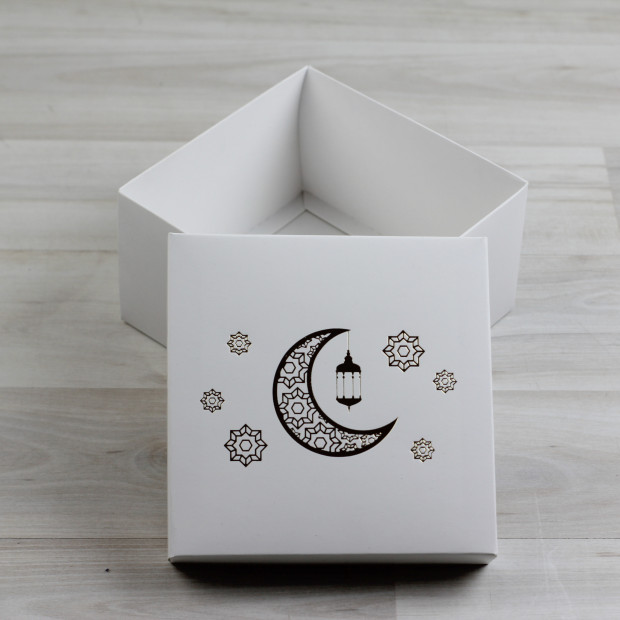 Коробка из мелованного картона. Крышка глухая с тиснением "Полумесяц". Тиснение выполнено золотой фольгой. Превосходно подходит для подарочных наборов.
