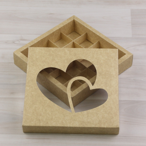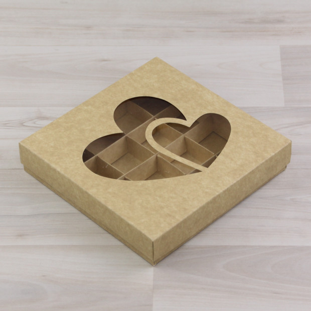 Коробка на 16 конфет из крафт-картона. Крышка с фигурным окном, защищенным прозрачным пластиком.