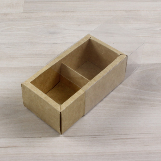 Коробка на 2 конфеты из дизайнерского картона. Крышка прозрачная из ПВХ, тип "Шубер" (задвигается как спичечный коробок) Склейка не требуется. Склейка шуберов производится полупрозрачной белой клеевой лентой, место склейки не является прозрачным.