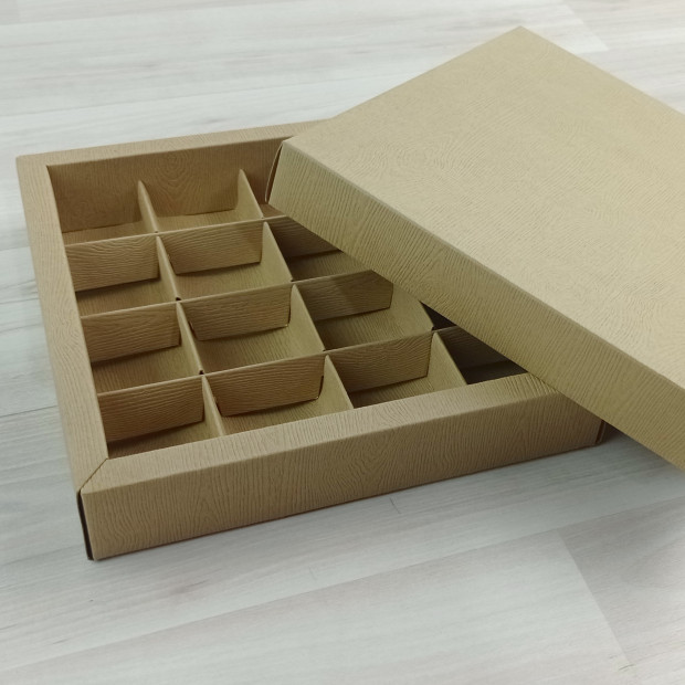 Полноцветная коробка на 16 конфет с разделителями.
