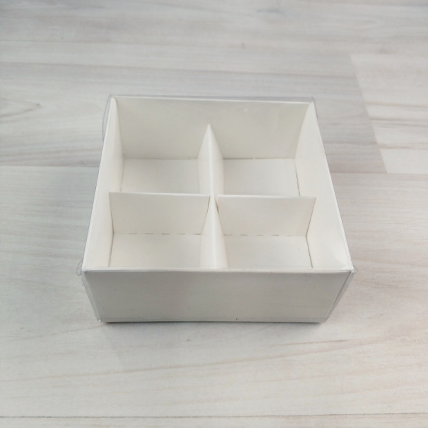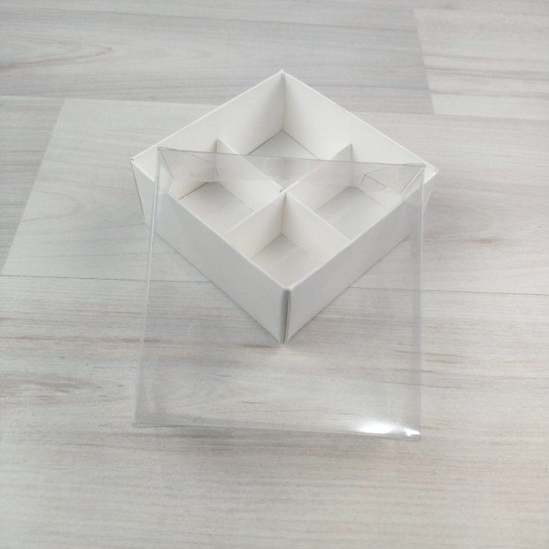 Коробка на 4 конфеты из мелованного картона. Прозрачная крышка.