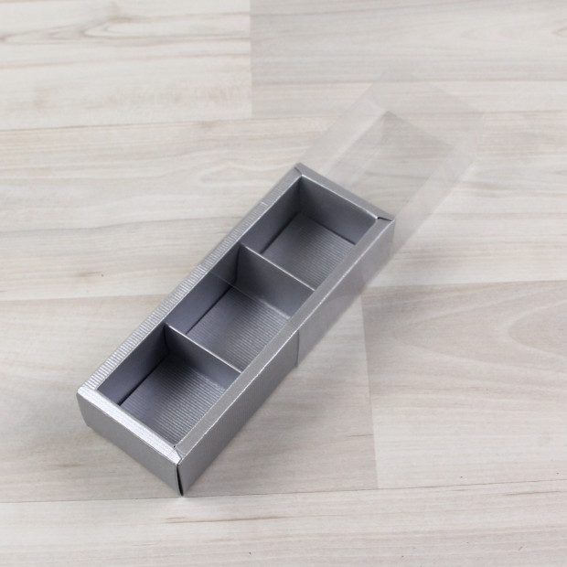 Коробка на 3 конфеты из дизайнерского картона. Крышка прозрачная, тип "Шубер" (задвигается как спичечный коробок) Склейка не требуется. Склейка шуберов производится полупрозрачной белой клеевой лентой, место склейки не является прозрачным.