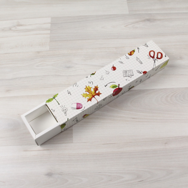 Коробка на 5 конфет из мелованного картона. Крышка глухая из дизайнерского картона, тип "Шубер" (задвигается как спичечный коробок). Склейка не требуется.