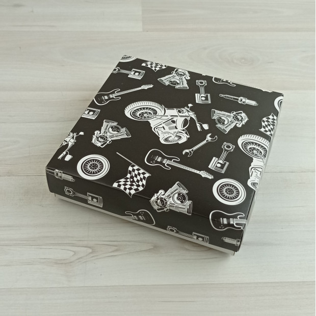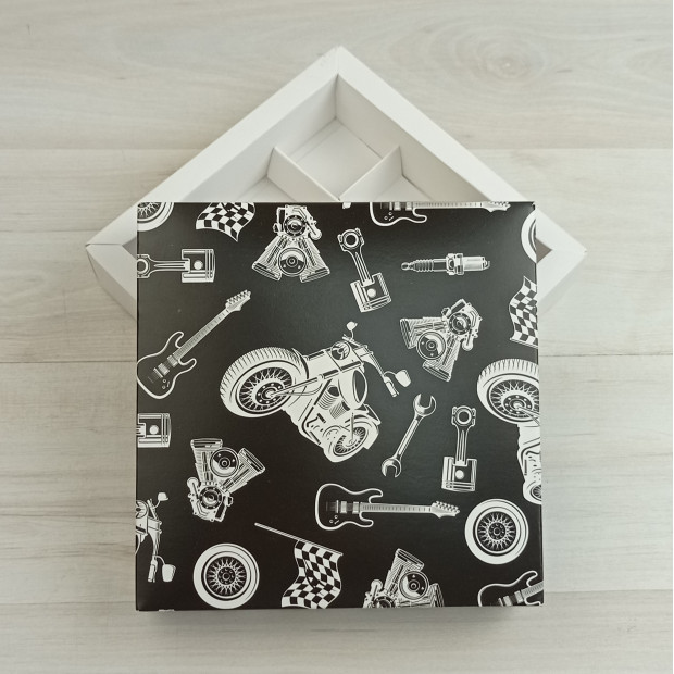 Крышка - дизайнерский картон/ дно и разделители - мелованный картон с тематическим рисунком.